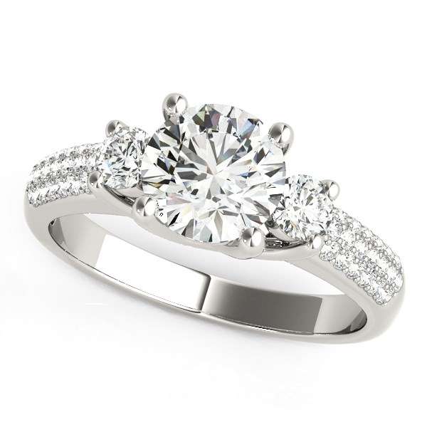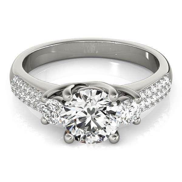 A fabulously stylish 3 stone ring with round diamonds and a gorgeous band with pave set stones. Designed in fine 14k white gold.