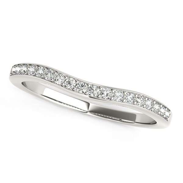 A darling wedding ring is showcasing round diamonds. Utterly elegant with a curved style, this beauty is made of 14k white gold.