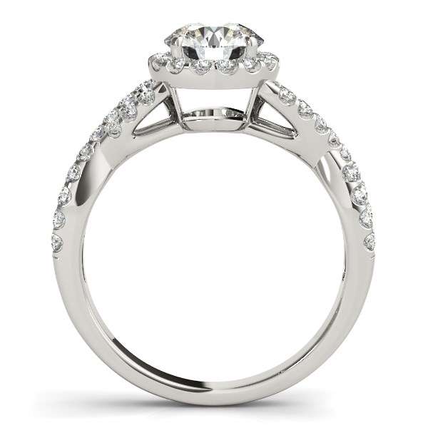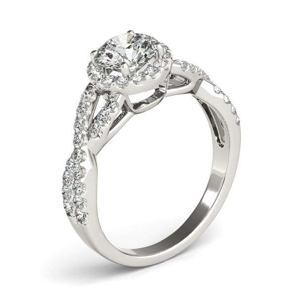 Pave set diamonds showcase the exquisite woven split shank design of this round cut diamond engagement ring. Wonderfully crafted in polished 14k white gold.