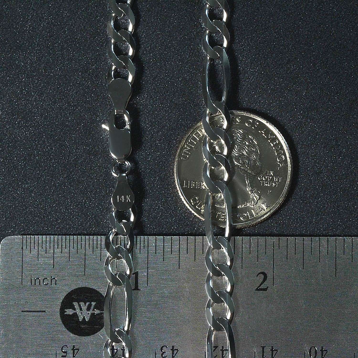 This solid Figaro chain comes in 14k white gold and has a width of 6.00 millimeters.